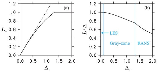 where is used as an abbreviation. For small , both Equations (17) and (18) provide . For simplicity, we apply , which is consistent with the LES setting; see the discussion following Equation (2). In terms of , this implies , which is not far from the standard value . The corresponding plots of implied by Equation (17) and according to Equation (18) (which are used for the discussion in Section 3.2) are shown in Figure 8. We see a plausible variation of with , and we see that L can become much smaller than .
