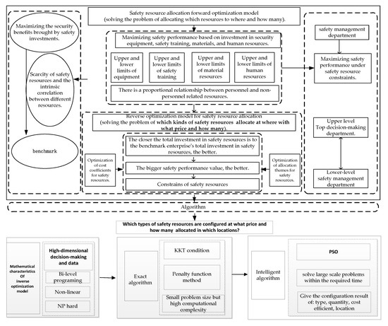The existing research on the inverse optimization methodologies of safety resources provided inspiration for this research. However, quaternion problems, such as which types of safety resources should be allocated at which risky point and at what price and quantity, have not yet been solved. To provide a quaternion decision based on the total cost of a safety resource benchmark, we formulated a forward optimization model with parameters (in this model, they were initial estimate values; these were not accurate). An inverse optimization model was then formulated based on the forward model. The inverse model inferred the parameters of the forward model; the optimal input was the predetermined input of the top decision-makers. A PSO algorithm was then used to provide allocation themes and resource parameter values.