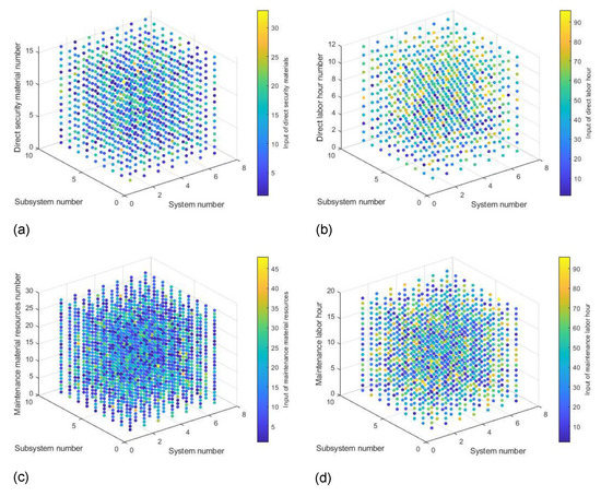 Shown in Figure 4a is the maintenance material configuration diagram. The x-axis represents the i-th system, the y-axis represents the j-th subsystem, the z-axis represents the k-th maintenance material, and the input quantity of the material is represented by color. For example, x (1,1,1) = 20; that is, the input quantity of the first maintenance material in the first subsystem of the first system was 20, and so on. Figure 4b is the maintenance person-hour configuration diagram. The x-axis represents the i-th system, the y-axis represents the j-th subsystem, the z-axis represents the r-th maintenance of human resources, and the person-hour input is represented by color. For example, t (1,1,1) = 40; that is, the person-hour input of the first repair and maintenance of human resources in the first subsystem of the first system was 40, and so on. Figure 4c is the configuration diagram of the direct safety guarantee materials. The x-axis represents the i-th system, the y-axis represents the j-th subsystem, and the z-axis represents the s-th direct safety guarantee material. The quantity of material input is represented by color. For example, x’ (1,1,1) = 1; that is, the input amount of the first direct security material in the first subsystem of the first system is 1, and so on. Figure 4d is the direct security labor person-hour configuration diagram. The x-axis represents the i-th system, the y-axis represents the j-th subsystem, the z-axis represents the u-th direct security human resource, and the person-hour input is represented by color. For example, t’ (1,1,1) = 8; that is, the person-hour input of the first direct security human resource in the first subsystem of the first system was 8, and so on.
