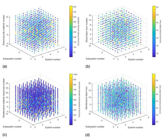 Shown in Figure 7a is the price configuration diagram of repair and maintenance materials. The x-axis represents the i-th system, the y-axis represents the j-th subsystem, the z-axis represents the k-th repair and maintenance materials, and the unit price of materials is represented by color. For example, a (1,1,1) = 178.2; that is, the unit price of the first repair and maintenance material resource in the first subsystem of the first system was 178.2, and so on. Figure 7b is the price configuration diagram of repair and maintenance labor hours. The x-axis represents the i-th system, the y-axis represents the j-th subsystem, the z-axis represents the r-th repair and maintenance human resources, and the unit price of labor hours is represented by color. For example, b (1,1,1) = 23.9; that is, the unit price of the first repair and maintenance person-hour in the first subsystem of the first system was 23.9, and so on. Figure 7c is the price configuration diagram of direct security guarantee materials. The x-axis represents the i-th system, the y-axis represents the j-th subsystem, the z-axis represents the s-th direct security guarantee material, and the unit price of the material is represented by color. For example, c (1,1,1) = 79.6; that is, the unit price of the first direct security material in the first subsystem of the first system was 79.6, and so on. Figure 7d is the direct security labor person-hour price configuration diagram. The x-axis represents the i-th system, the y-axis represents the j-th subsystem, the z-axis represents the u-th direct security human resource, and the person-hour unit price is represented by a color. For example, d (1,1,1) = 42.2; that is, the unit price of the labor hour of the first direct security human resource in the first subsystem of the first system was 42.2, and so on.