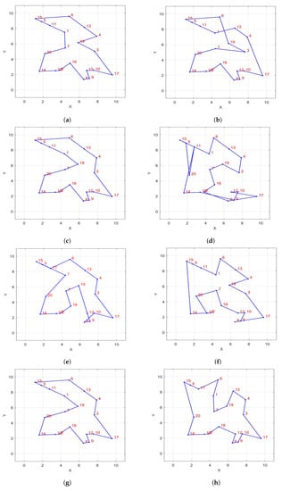 A simple traveling salesman problem (TSP) is used to find the shortest route for visiting all cities u, as given in Table 9 [19]. The control variable in this problem is to decide whether to travel between the i-th city () and the j-th city () or not as given by the following expression: