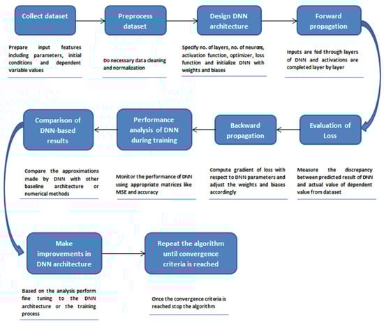 Once the model is trained, we validated the model, which helps to improve the performance of the model by adjusting parameters [] and hyperparameters such as the number of epochs and the learning rate, and then we test the model to see if it could handle new data points. As a final stage, the accuracy and loss of the suggested methodology were determined by comparing the findings to those of a conventional numerical method. We took advantage of the state-of-the-art programming language Python to simulate and visualize the results of our model of a system of a differential equation. The DNN-based technique is clearly illustrated in Figure 3, which makes it easier to analyze and comprehend the steps required in approximating a dependent variable with a DNN.