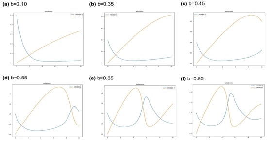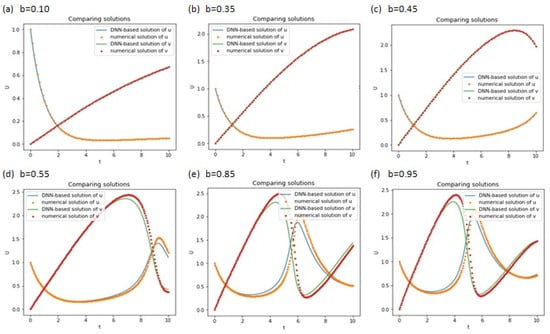 Figure 4 shows oscillations produced during the glycolysis process evaluated using a DNN-based method. We noticed impacts of various values of parameter “b” ranging from 0.10 to 0.95 on the oscillations while holding the parameter “a” fixed to a value of 0.08 as shown in all the graphs of Figure 4. In the second training run, these outcomes were attained. In Figure 4, the orange color represents the solution of Equation (1)(a) and the blue color represents the solution of Equation (1)(b). Figure 4 shows that as the value of “b” rises, there are a growing number of oscillations. For smaller values of b, the oscillations begin as tiny and the graphs for v show monotonic declines while graphs for u show abrupt increases that eventually achieve their maximum value. Oscillation values rise along with increasing values of b, and they abruptly shift after a while.