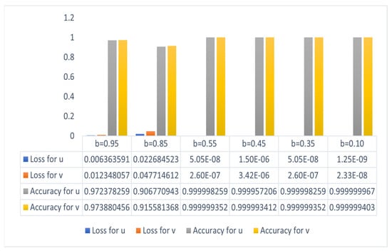 We performed an error analysis and documented the loss and accuracy of the desired model in order to verify the veracity of our suggested advanced DNN-based scheme, as is evident from the bar graph shown in Figure 6. It shows the loss and accuracy for both u and v. It is clear that, starting at b = 0.95, we have little loss but high accuracy, and that, for b = 0.85, accuracy temporarily decreases. However, for a decrease in the value of parameter b, we observed maximum accuracy in the case of b = 0.10. It is observed that the proposed architecture of the DNN outperformed the traditional numerical techniques for the nonlinear dynamical system, as it produces findings that are precise and effective.