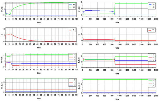In order not to make the illustration too intricate, we will assume that organisms include only three chemical elements—oxygen, carbon, and hydrogen. Hence, in this illustrative model, organisms will consist only of fats (palmitic acid—C16H32O2—will be used as a typical representative), lignin (cinnamic acid tetramer C10H11O2 will be used as an average representative), glucose—C6H12O6, and cellulose—(C6H10O5)n. These typical representatives were chosen to assess the potential level of closure of real CELSS [39].