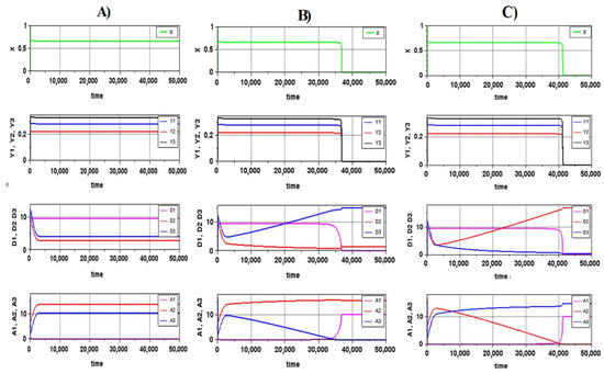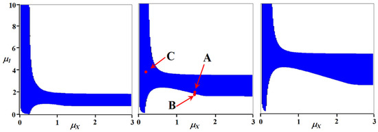 The parametric portrait of the system for the non-rough case of stoichiometric ratios of the second decomposer (the values correspond to Figure 5): (A) a12 = 0.25, a22 = 0.1, a32 = 0.65; (B) a12 = 0.4, a22 = 0.1, a32 = 0.5; (C) a12 = 0.7, a22 = 0.1, a32 = 0.2. The red arrow denotes the regions of the parameters corresponding to the steady state.