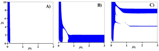 To visualize the feasibility of the presence of the steady closed state in the system under conditions (7), we construct a parametric portrait of the model, that is, we estimate the regions of existence of a steady/quasi-steady state on the plane of the selected parameters. These parameters will be the specific growth rates of the autotrophic component (μX) and one of the heterotrophs (μ1) at different values of the stoichiometric composition of the other heterotroph.