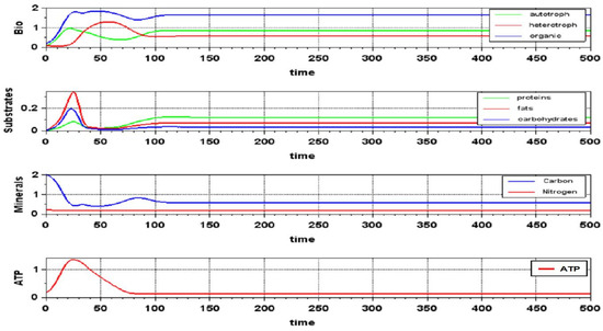 A trial numerical integration of the system equations for different parameters confirmed the feasibility of a steady state in this model (Figure 2A). At the same time, combinations of parameters for which there is no steady state were more common than combinations corresponding to a steady state. However, even in the absence of a steady state in the system, interesting dynamics of the transition process is observed: while the variables describing the key nutrients in mineral and organic (detritus) forms undergo changes, the variables describing the biomass of organisms have large values and almost do not change. The system looks quite safe. However, when the transition process is over, the system rapidly breaks down (Figure 2B).