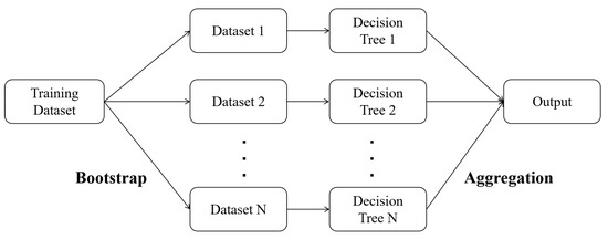 The steps involved in the RF model are as follows [39]. Firstly, N training datasets are generated using the bagging method by sampling from the original training dataset. Secondly, N decision trees are trained independently based on these N training datasets. Thirdly, the random forest is composed of these N decision trees. In classification problems, the final classification result is determined by aggregating the predictions of the N decision tree classifiers. For regression problems, the average of the predicted values from the N decision trees determines the final prediction result. In summary, random forests are formed by integrating a large number of decision trees as the basic unit.