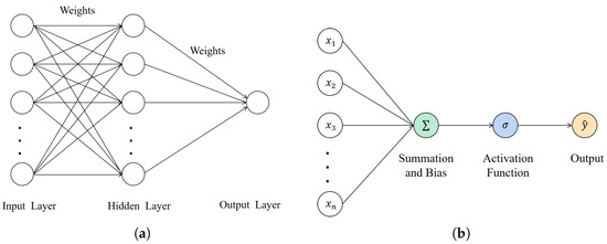 Figure 2. The construction of neural networks. (a) Two-layer fully connected neural network. (b) Activation function.