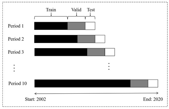 Given the computational complexity associated with machine learning, we adopted the sample splitting approach introduced by Gu et al. [10] to annually update the prediction model. When modifying the model, we expanded the size of the training sample by 1 year, while the validation period and the 1-year test period shifted forward to include the most recent 12 months. The data spanning from January 2002 to December 2020 were divided into 10 periods, as illustrated in Figure 3.
