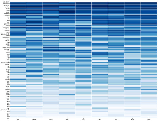 where c s , t 1 is a P C × 1 matrix of the firm’s micro-feature matrix, x t 1 is a P X × 1 matrix of the macro-variables, and z s , t 1 represents a P C P X × 1 matrix of the combined macro–micro dataset. The total number of covariates was 70 × (10 + 1) = 770. It is worth noting that z s , t 1 contains the interactions between stock-level characteristics and macroeconomic state variables, thereby providing deeper insights into stock return forecasts.