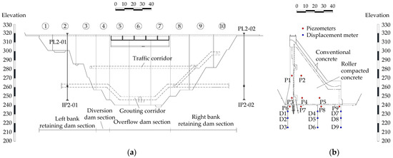 The RCC gravity dam: (a) upstream elevation view and division of dam sections; (b) layout of monitoring instruments for key dam section (unit: m).