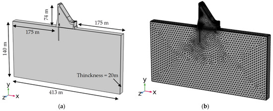 Finite element model of the overflow dam section: (a) geometry model; (b) model meshing.