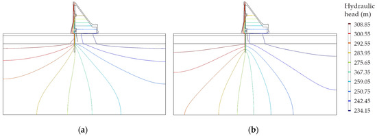 Figure 3 shows the distribution of hydraulic head in the dam body and foundation under normal reservoir level conditions during operation, considering and not considering the seepage–stress coupling effect. As can be seen from Figure 4, the distribution pattern of hydraulic head contours for the dam considering and not considering the seepage–stress coupling effect is basically consistent. By comparison, it can be seen that the hydraulic head contours are dense at the concrete face slab and curtain of the RCC dam, indicating that the face slab and curtain have good anti-seepage ability. When considering the seepage–stress coupling effect, the stress is small in the shallow rock and large in the deep rock. Therefore, in the vicinity of the shallow heel of the dam, the hydraulic head contour distribution under coupled and uncoupled conditions is relatively close. In contrast, the seepage–stress coupling effect in the deep rock is obvious, and the difference in hydraulic head contour distribution is significant, and the hydraulic head contours considering the seepage–stress coupling effect are biased towards the upstream.