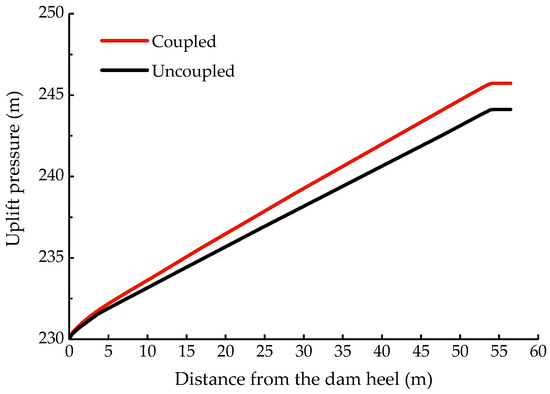 As can be seen from Table 3, the foundation uplift pressure considering the seepage–stress coupling effect is higher than that under the uncoupled condition. The uplift pressure coefficient of the foundation under the coupled condition is 0.19, while that under the uncoupled condition is 0.17, both of which are smaller than δm. According to the design situation, the uplift pressure of the dam meets the requirements. However, the foundation uplift pressure considering the coupling effect is greater than that which ignores the coupling effect. Therefore, in order to conduct more accurate safety monitoring and safety evaluation of the dam, it is necessary to consider the interaction of seepage and stress.