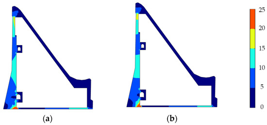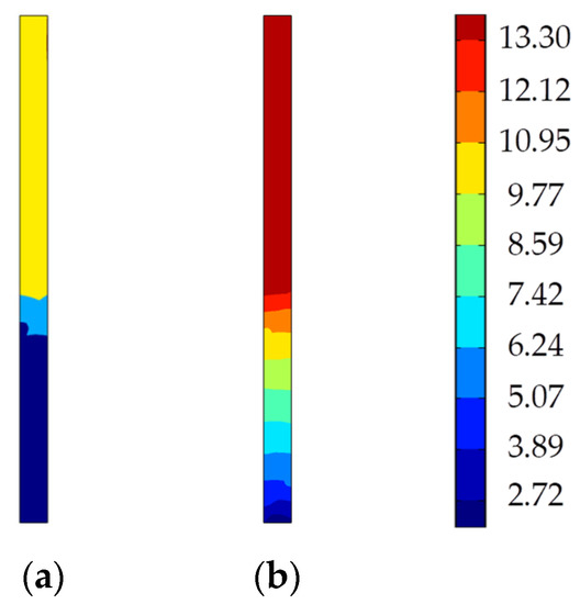 Figure 6 shows the contour maps of seepage gradient distribution on the concrete face slab of the dam under the coupled and uncoupled scenarios. The results shown in Figure 6 indicate that the seepage gradient distribution pattern on the concrete face slab is basically consistent under the coupled and uncoupled scenarios, and their maximum seepage gradients are both concentrated at the connection between the dam bottom surface and the curtain. When considering the seepage–stress coupling, the maximum seepage gradient on the concrete face slab is 25.3; when ignoring the coupling effect, the maximum seepage gradient on the concrete face slab is 24.1.