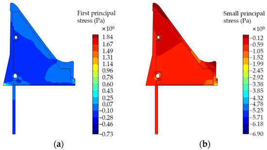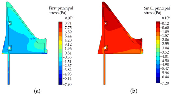 Stress distribution in RCC dam under uncoupled scenario: (a) first principal stress; (b) small principal.