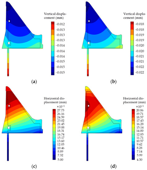 Displacement distribution in RCC dam: (a) vertical displacement considering coupling; (b) vertical displacement ignoring coupling; (c) horizontal displacement considering coupling; (d) horizontal displacement ignoring coupling.