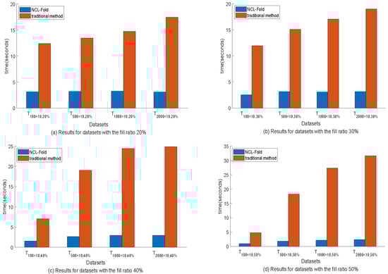 From Figure 5, we can see that: (i) NCL-Fold significantly outperformed the traditional method in every case; (ii) the performance gap was bigger when the number of attributes, fill ratios, and changes of granularity sizes were the same, respectively, and the number of objects increased.