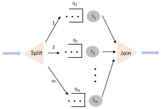 Split–join networks are a key modeling tool for parallelism in operations research, queueing models, and supply chain management. The basic split–join network (also known as the fork–join network), is a one-stage network (see Figure 1). A stream of projects arrives at the split node (the first pink triangle), where each project is split into m tasks that are allocated to m parallel servers (the gray circles). A task may have to wait in a queue (the black rectangle) until its server finishes all previous tasks. After the task is completed, it waits in a join-type queue (the second pink triangle) until all the other tasks of the same project are completed. When all m tasks of the same project are completed, they rejoin (are synchronized) at the join node. The sojourn time is the time from the arrival of the project until its completion. (i.e., until its departure from the join node). Here, the terminology “server” is used when talking about something that processes tasks, such as a machine, a single CPU core, or a single thread. Additionally, the label “queue” is used to represent the place where the task waits. Accordingly, there are two types of queues: a queue before each server where the task is delayed due to a busy server, and a queue where a group waits until all the parallel groups are completed. In the remainder of the paper, the author refers to these two types of queues as operational queues and synchronization queues, respectively.