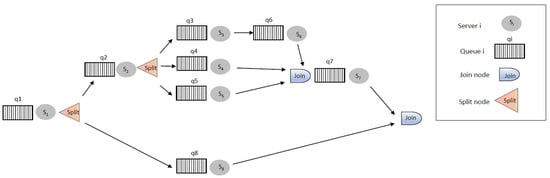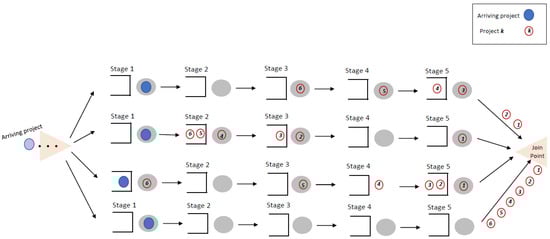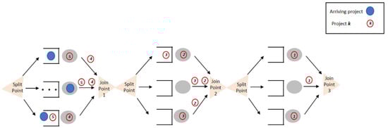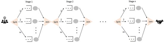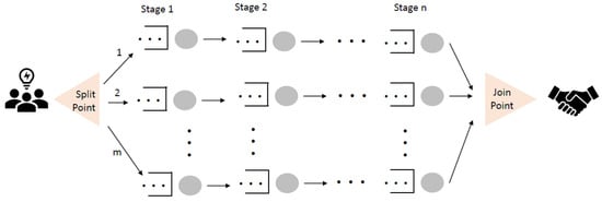 A project arrives and splits into m parallel groups, each including n subsequent stages allocated to n different servers (in total, tasks). When group i, , completes its n stages, it enters the synchronization queue, waiting for the other groups of the same project to be completed. The project leaves after all its groups are completed. A typical parallel split–join network is presented in Figure 3.