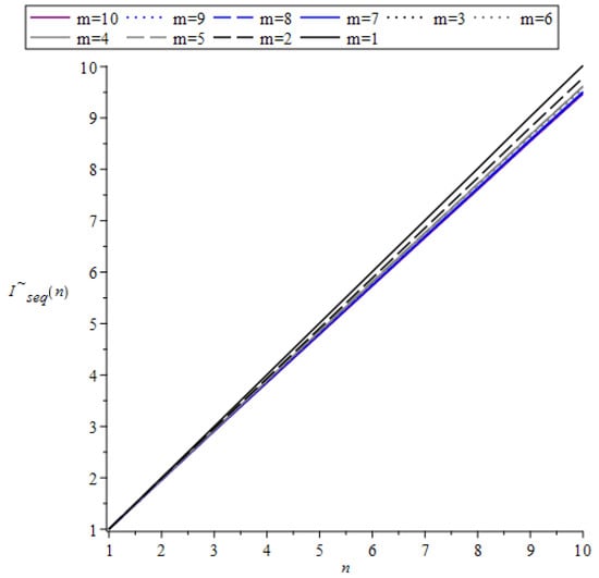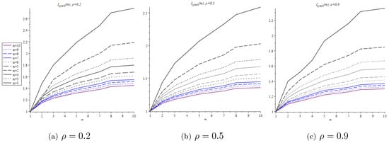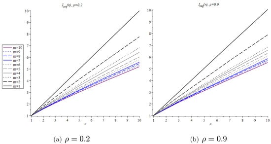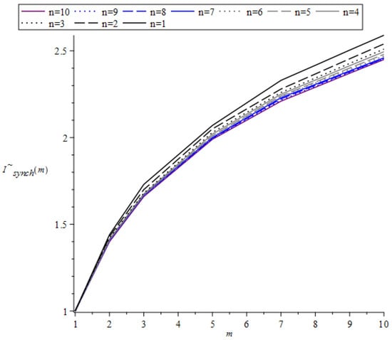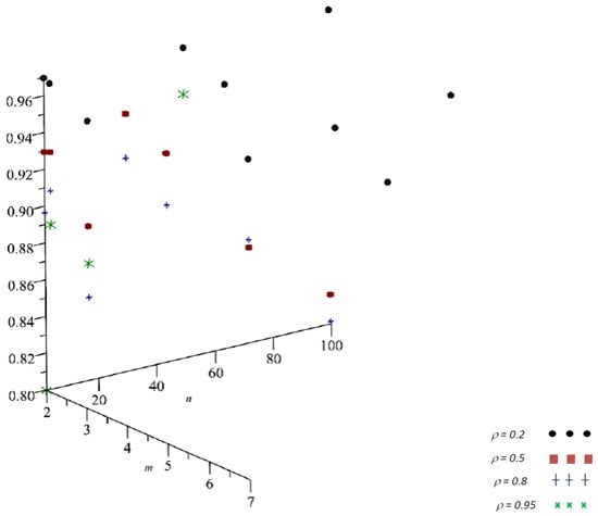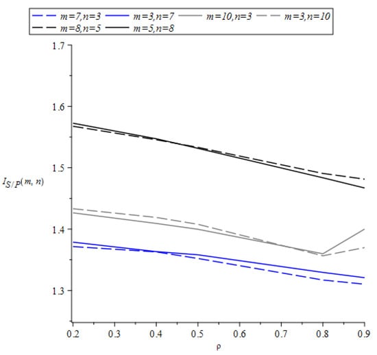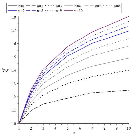 Equation (21) implies that the added time in the serial system beyond that of the parallel system is relatively similar due to parallelism (i.e., increasing m) or due to seriality (i.e., increasing n). For example, Figure 16 shows and its dual-value (solid and dashed curves, respectively) for the pairs as a function of We see that (blue curves), (black curves), and (gray curves);