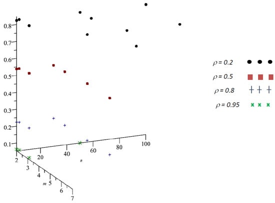 - The second lower bound is obtained by assuming no splitting into m groups; i.e., (System 2). Let be the sojourn time. It is well known that , and, thus,Comparing Systems 1 and 2 (the lower bounds) to the parallel system highlights the different types of delays. The difference between the performance of System 1 (without operational queues) and the parallel system gives an estimate of the waiting time for a server. Moreover, the difference between the performance of System 2 (without splitting) and the parallel system gives an estimate of the impact of the final synchronization. Obviously, the quality of the bounds depends on the servers’ utilization. When is low, neglecting operational delays is acceptable and, thus, the first bound performs better. However, as increases, the operational delays become significant and the additional delay due to synchronization is negligible; thus, the second bound is preferred;