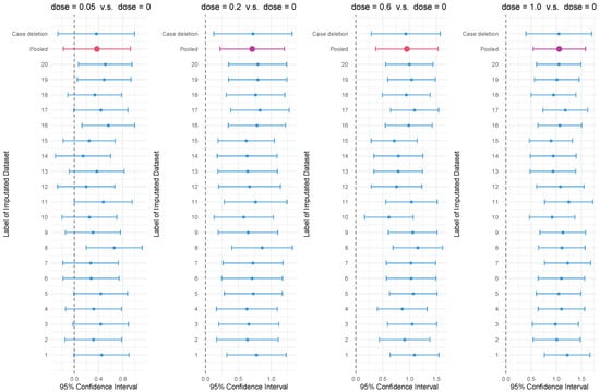To test the homogeneity of variance in the underlying distribution, we performed Levene’s test with squared residuals [39] on the incomplete data. Since the p-value of the test is 0.125, the null hypothesis of homogeneity of variance is not rejected under the significance level of 0.05. Using the proposed procedure under assumption of homogeneity of variance in Section 3, the point estimates and their 95% two-sided confidence intervals of this four-to-one comparison of group means were drawn from the 20 imputed complete datasets, as given in the first section of Table 6. Additionally, the point and interval estimations based on each imputed dataset by the standard Dunnett’s procedure and the pooled point and interval estimations based on 20 imputed datasets by the proposed procedure are illustrated in Figure 1. The pooled confidence intervals show that, based upon the incomplete dataset, an active drug dosage of 0.2, 0.6, or 1 has significantly better response than placebo. Compared to the proposed procedure, the lengths of confidence intervals by naive deletion Dunnett’s procedure, presented in the second section of Table 6, are wider, implying a significant improvement in interval estimations using the proposed method, while there is not much difference between the point estimates by the two procedures.