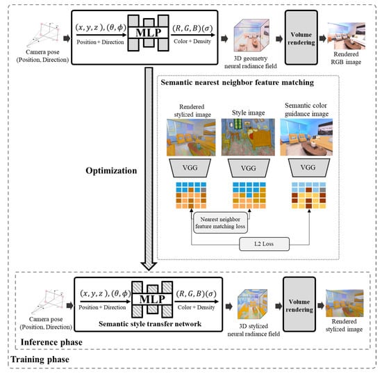 The proposed methodology for 3D scene style transfer via semantic nearest-neighbor feature matching encompasses two stages. The initial stage entails training the geometric neural radiance fields, and the succeeding stage involves training the style neural radiance field. In the context of geometric neural radiance fields, 360-degree stable-viewpoint images and their corresponding poses were first derived from a 3D virtual environment. Subsequently, a neural radiance field [] was employed to learn 3D geometric scene information intrinsic to the virtual environment. In the style neural radiance field training stage, style neural radiance fields are honed by optimizing the learned geometric neural radiance fields via semantic nearest-neighbor feature matching. This process incorporates not only learning the characteristics of the style image but also the attributes of the semantic color guidance image, which serves as a guide for style in the semantic domain. Optimized-style neural radiance fields are utilized for differentiable volume rendering, thereby generating 360-degree free-viewpoint images with a converted style while preserving the structure of the 3D virtual environment. In the following sections, a detailed description of each stage is provided.