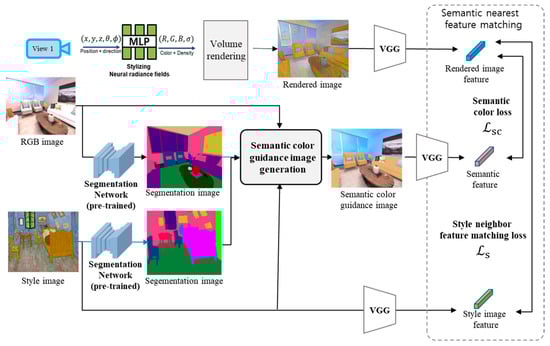 During this phase, , having undergone training, is optimized into to learn the style. The learning structure of the network is shown in Figure 4. We begin by initializing the parameters of network, which were trained for the 3D structure. When we input the position value and direction at a specific spatial point, the network outputs color and density. Subsequently, volume rendering was used to depict the image at that spatial point. Initially, the model generates a conventional RGB image; however, as the learning progresses, it begins to convert an image to the chosen style. To learn the style, we extracted features of the style and rendered images using a pretrained VGG model [] and gradually reduced the loss by comparing these features. Furthermore, the model was trained to decrease the loss between the original image and the rendered image by creating a semantic color guidance image, aiding in the semantic conversion of the style. We employed a pretrained segmentation network [] to derive a segmentation image from both RGB and style images to create a semantic color guidance image. Upon inputting the extracted segmentation and RGB images into the semantic color guidance image generation module, semantically relevant colors were generated. Section 3.2.1 provides a comprehensive explanation of the semantic color guidance image generation module.