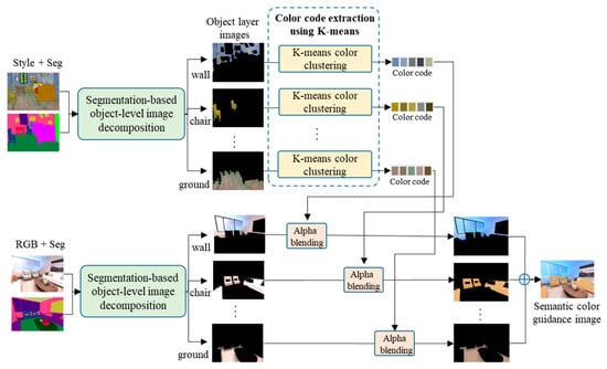 This section outlines the procedure for employing the semantic color guidance image generation module to achieve semantic colors, as illustrated in Figure 5. Initially, decomposition into object-level images was performed using style and segmentation images. Subsequently, from the object-layer image partitioned into distinct object classes, K color codes were obtained through k-means clustering, with an emphasis on extracting the color exhibiting the highest occurrence ratio.