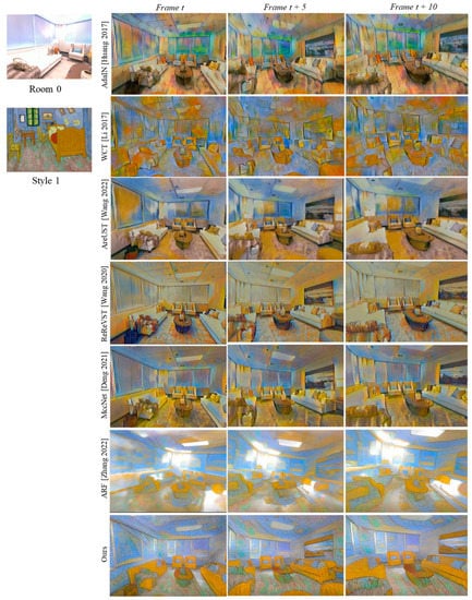 Nevertheless, the existing studies on style transfer have three primary limitations. First, training a style transfer network tailored to 3D virtual environments necessitates a considerable quantity of style image data that mirror the viewpoints of the virtual environment. Existing studies related to style transfer rendering generally feature restricted viewpoints, primarily because frequent viewpoint alterations within a 3D virtual environment render procuring numerous style images with analogous viewpoints challenging. The second issue pertains to a lack of consistency within the 3D structure. In single-frame image unit style transfer studies [,,,], only 2D input image features are considered, thereby excluding 3D scene geometry information. Consequently, when the viewpoint is altered, as shown in the first row of Figure 2, the 3D structure of red and yellow dashed box areas is not preserved. As indicated by the yellow and red regions, despite occupying the same position, the colored area of the wall undergoes minor variations in each frame owing to style transfer. Such inconsistencies are unsuitable for real-time style transformation rendering, such as VR/AR, as the scene perpetually flickers and the 3D structure of the scene modifies when the video is observed continuously.
