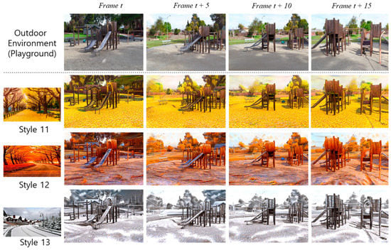 Figure 9 demonstrates the effectiveness of the proposed method in transferring styles, not only within virtual 3D environments but also in real outdoor 3D environments. The proposed method adeptly transforms the textures of diverse objects and areas, such as trees or floors, to align with each style image, while preserving the overall shape of the scene.