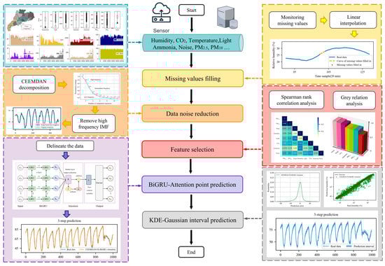 The proposed architecture of the hybrid medium and long-term RH prediction model mainly consists of five modules: data preprocessing, data denoising, feature selection, RH point prediction, and interval prediction. The data preprocessing module involves linear interpolation to fill in missing data in the sensor-collected Internet of Things (IoT) datasets and ensure data completeness. The data denoising module primarily employs CEEMDAN to decompose RH data and removes the intrinsic mode functions (IMFs) located in the high-frequency region of permutation entropy, thus achieving noise reduction of RH data. In the feature selection module, Spearman rank correlation analysis and GRA are used in feature selection to select out environmental factors with low correlation and similar to RH, simplifying the model training process and enhancing prediction performance. In the RH point prediction module, data is separated into training, validation, and test sets, and a BiGRU-Attention model is built to train on the training set, adjust model parameters using the validation set, and prevent overfitting, finally conducting testing on the test set. In the RH interval prediction module, a KDE and Gaussian kernel function is used to fit the distribution of point prediction errors in the validation set, ultimately achieving medium and long-term point and interval predictions for future RH. The methodological framework is shown in Figure 1.