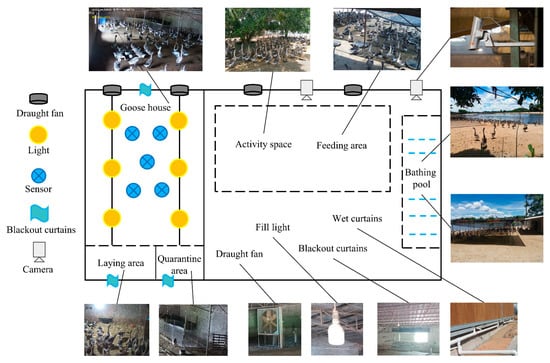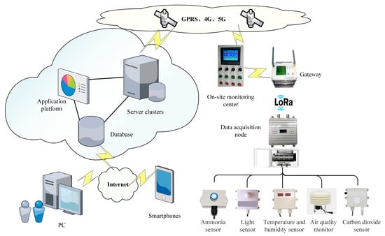 In this study, the Magang Goose Intensive Breeding Base, situated in Jiangmen City, Guangdong Province, China, served as the designated area for collecting experimental data. We have constructed an IoT-based remote monitoring platform for waterfowl-intensive farming environments, as shown in Figure 2. We used eight IoT sensors to collect real-time PM2.5, PM10, CO2, humidity, light, ammonia, temperature, and noise in poultry houses at intervals of 20 min. To ensure the rigor and consistency of the experiment, this study selected the integrated environmental monitoring device from Guangzhou Hairui Information Technology Co., Ltd. (Guangzhou, China). The specific parameters are shown in Table 1. The sensors were chosen to be installed in the goose house, with the CO2 concentration sensor and total suspended particulate matter sensor positioned 2.4 m above the ground, while the other sensors were positioned at a height of 3.0 to 3.1 m above the ground. As shown in Figure 3, the gateway is used to transmit the IoT-collected data to the database of the remote cloud service center, which can be accessed by the user through a computer browser or smartphone application for easy use.