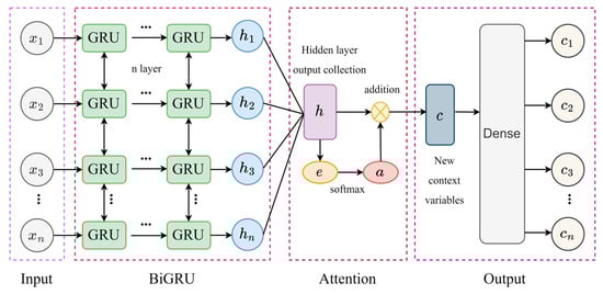 The attention mechanism simulates the way human brains think. When processing received information, the brain focuses on important information and ignores irrelevant things. By incorporating the attention mechanism into the time series prediction process, correlations between multiple dimensions of the time series can be effectively explored, and the utilization rate of historically important information can be improved, thereby enhancing the predictive performance of the model []. We add an attention mechanism layer behind the BiGRU neural network to prevent the model from losing significant information due to long time series.