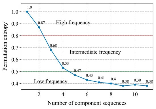 Due to various factors such as weather, human activities, and monitoring methods, the RH data collected by IoT sensors are inevitably subject to certain interference, resulting in instability, volatility, and noise. Noise increases the difficulty for models to discover important information, leading to poor performance during model training or overfitting, affecting the accuracy and robustness of the model []. To reduce the random interference caused by noise, this study employed the CEEMDAN method, in combination with permutation entropy, to denoise the data. Firstly, the CEEMDAN was used to decompose the RH data into multiple IMFs, and the permutation entropy of each IMF was calculated, respectively, as shown in Figure 6.