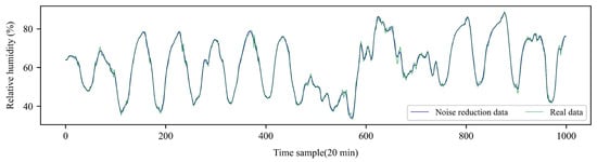 We can observe that the permutation entropies of IMF1 and IMF2 are in the high-frequency area, indicating that these two IMFs are relatively complex and irregular compared to other IMFs. Therefore, they were regarded as noise and removed. After the denoising process was complete, we extracted the first 1000 pieces of data to observe the denoising effect. As shown in Figure 7, the RH sequence after denoising is smoother and more stable than the original data, indicating that the denoising method can significantly extract non-stationary features and reduce the volatility and complexity of the RH sequence.