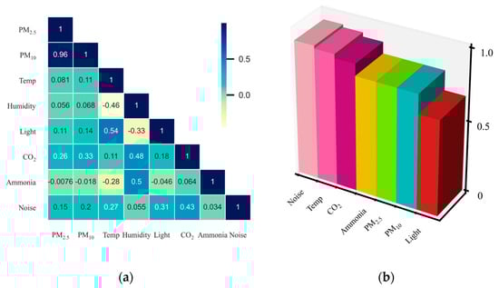 The environmental factors within poultry sheds are interrelated and coupled, requiring careful consideration of the impacts of different environmental factors on RH. This study conducted experimental comparisons of multiple feature selection methods and ultimately found that utilizing Spearman rank correlation analysis and grey relational analysis (GRA) yielded the optimal results in selecting important environmental factors. The former mainly considers the degree of correlation between RH and different environmental factors, while the latter considers the similarity of the curve changes between RH and different environments, and the calculation results are presented in Figure 8. According to Figure 8a, it can be seen that temperature, carbon dioxide, ammonia, and light have a higher correlation with RH than other environmental factors. However, the GBD between light and RH is relatively low in Figure 8b, only 0.672, indicating that the curve change pattern of light and RH has some differences, and their similarity is not very high. Therefore, considering the results of both the Spearman rank correlation analysis and GRA, temperature, carbon dioxide, and ammonia are further selected as the input factors for the prediction model.