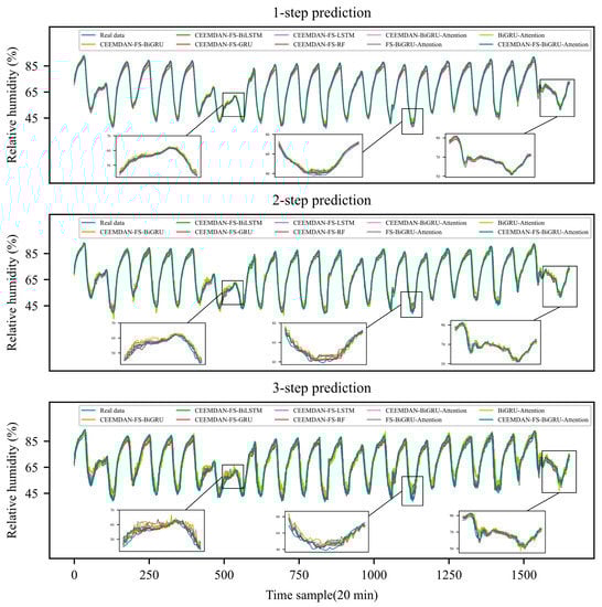From the perspective of the prediction framework, feature selection and data denoising can fully extract features highly correlated with RH, remove noise, and eliminate the influence of redundant factors, thereby enhancing the quality of the model input. From the perspective of the baseline model, BiGRU can fully explore the correlation between model inputs and outputs and has good fitting ability. The introduction of an attention mechanism enables capturing the long-term dependence of the RH sequence and effectively improves the situation where important information is lost due to excessive data during BiGRU training. Compared with LSTM, CEEMDAN-FS-BiGRU-Attention reduced the MAE, RMSE, and MAPE for predicting the future 3 steps by 57.7%, 48.2%, and 56.6%, respectively, demonstrating outstanding predictive performance.