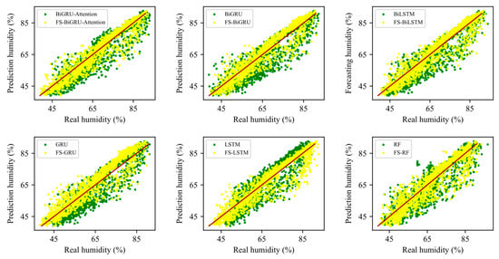 After feature selection, the MAE of FS-BiGRU-Attention and FS-BiGRU models for predicting the future 3 steps decreased by 23.0% and 18.1%, respectively, and their RMSE decreased by 25.6% and 32.2%, respectively. Additionally, the MAPE also decreased by 22.8% and 18.1%. As shown in Figure 11, other baseline models’ predictive errors were reduced, and their prediction performance significantly improved after the feature selection process. This indicates that the feature selection method based on Spearman rank correlation analysis and GRA can effectively select out environmental factors that have a high correlation with RH and similar trend changes. By eliminating redundant environmental factors, feature selection can help models focus on relevant and useful covariates, making it easier to uncover causal relationships between input and output data and thereby improve the predictive performance.