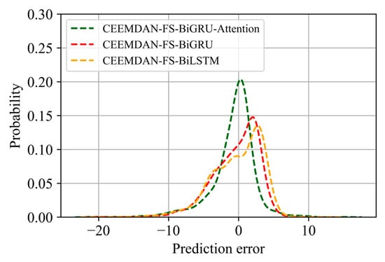 To compare and access the interval prediction performance of different models, this study conducted a comparative analysis using BiGRU and BiLSTM as baseline models. Figure 13 shows the error probability distribution function curves of different baseline model validation sets fitted by KDE-Gaussian. It can be observed that the error distribution of CEEMDAN-FS-BiGRU-Attention is relatively concentrated, mainly between [−7, 7]. The error distribution of CEEMDAN-FS-BiGRU and CEEMDAN-FS-BiLSTM are more dispersed, mainly between [−9, 9]. This indicates that CEEMDAN-FS-BiGRU-Attention has smaller errors on the validation set and better predictive performance than the other two models.