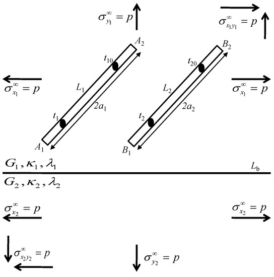 Consider two cracks, and , in the upper part of thermoelectric-bonded materials subjected to remote stress as shown in Figure 3.