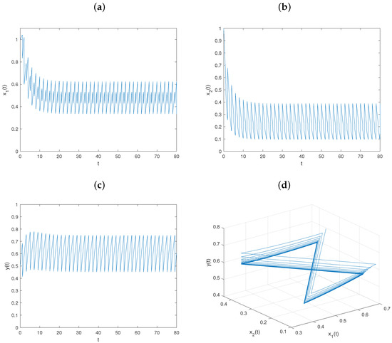 Dynamical behavior of system on predator-extinction periodic solution with : (a–c) time series of populations x, y, and z; (d) phase portrait of system (6).