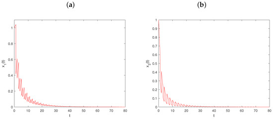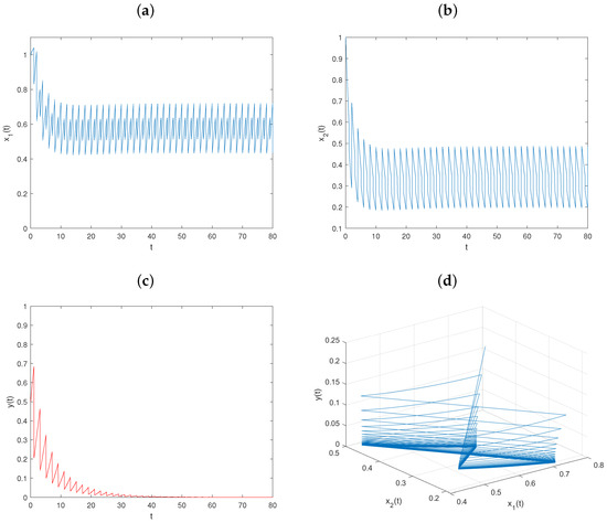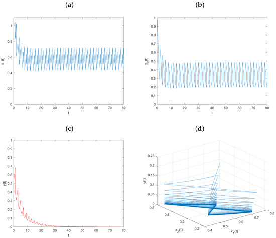 Let , , and keep fixed the values of other parameters, as in Figure 1. Then, , , and conditions and hold. From Theorem 3, the trivial solution of system is globally asymptotically stable (see Figure 7).