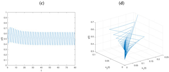 Dynamical behavior of system on trivial solution with , : (a–c) time series of populations x, y, and z; (d) phase portrait of system (6).