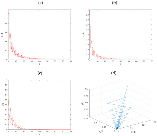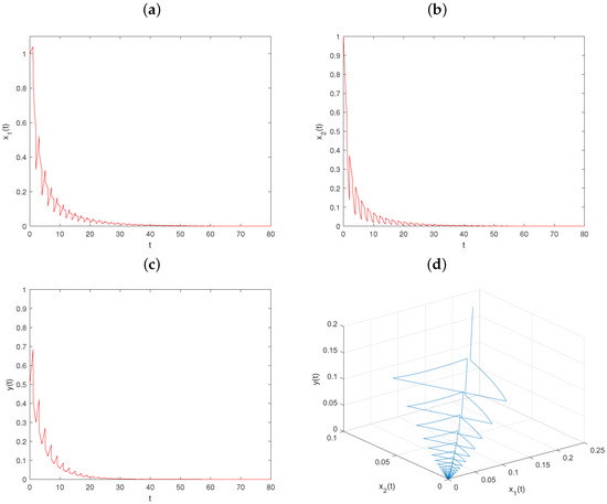 Let , , and keep fixed the values of other parameters, in as Figure 1. Then, , , and conditions and hold. From Theorem 3, the trivial solution of system is globally asymptotically stable (see Figure 4).