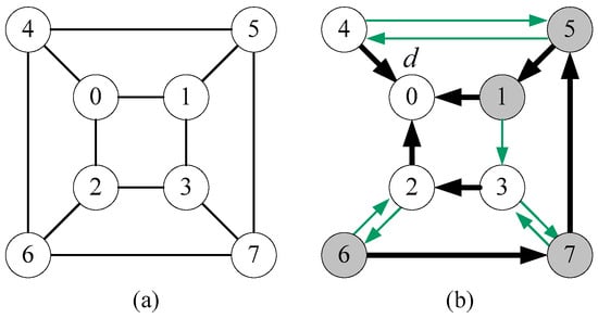 In this paper, we proposed a new tree structure in Definition 7. Similar to CISTs, spanning trees T1 and T2 are used to construct a protection routing. However, the difference from CISTs is that we only need stem-disjoint. Obviously, d is the root of the first tree. We need another node d′ to be the root of the second tree. In order to connect the stems of the two trees, (d, d′) must exist. Finally, d′ must have a neighbor w (≠d) as its second next-hop. For example, Figure 2 shows dual-PRT0s. The inner nodes of T1 are vertices 0, 2, 3, and 4, and the inner nodes of T2 are vertices 1, 5, 6, and 7. T1 and T2 follow Definition 4. Then, the stem sets of T1 and T2 are {(0, 2), (0, 4), (2, 3)} and {(1, 5), (5, 7), (6, 7)}, respectively, and they follow Definition 6. Finally, let d′, w be vertices 1 and 3, respectively. Since (0, 1) is a leaf edge in T2 and vertex 1 is adjacent to inner node 3 in T1, according to Definition 7, T1 and T2 are dual-PRT0s. In fact, Figure 1b shows the protection routing configured by T1 and T2. We propose a formal construction algorithm later.