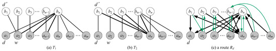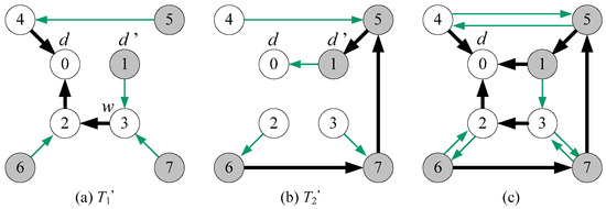 For example, taking Figure 2a,b as input, according to steps 1 and 2 of Algorithm 1, we have T1′ and T2′, as shown in Figure 3a,b. Next, classify the stems and leaf edges of the two trees into primary links or alternative links according to steps 3 and 4, and then a protection routing R0 can be obtained, as shown in Figure 3c.
